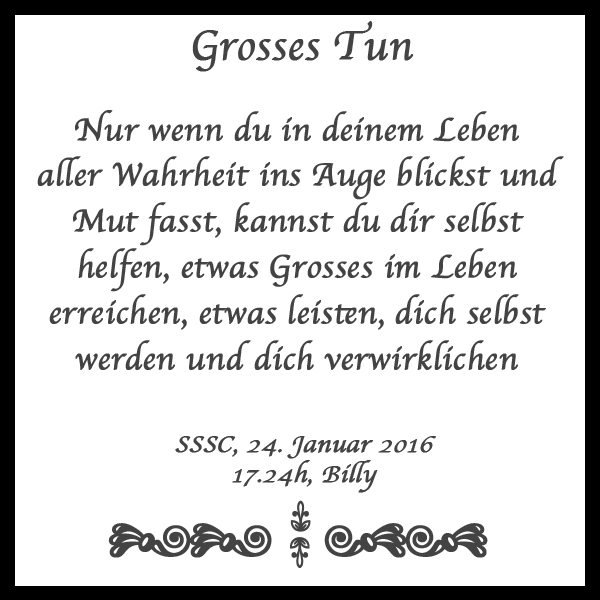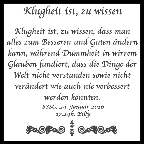 Billy: Da grüss ich dich ebenfalls, sei willkommen, Bermunda. Leider sehe ich alles etwas verschwommen, denn ich habe meine Augen operieren lassen, erst das linke und jetzt das rechte, folglich es nun einige Tage dauern wird, bis ich alles wieder völlig klar zu sehen vermag. Die Brille, die ich trage, ist leider schon alt und zerkratzt, auch meine Computerbrille hier, folglich ich momentan wie ein Esel am Berg stehe und nicht am Computer arbeiten kann. Daher wäre ich froh und dir dankbar, wenn du meine E-Mails durchsiehst, denn vielleicht ist etwas Wichtiges dabei, das ich beachten müsste. Du weisst ja auch in etwa, wie das Ding hier funktioniert. Also bitte …